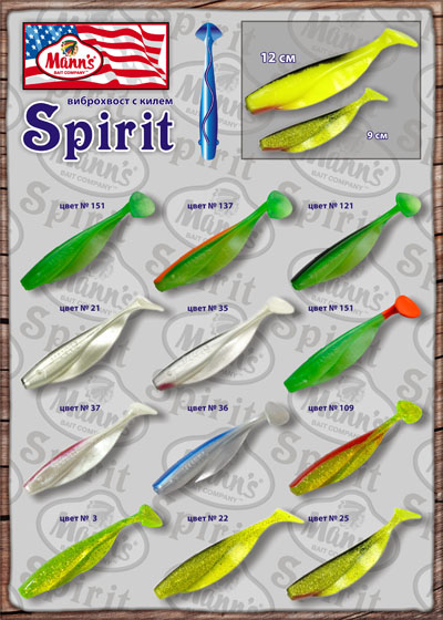 Виброхвост Spirit изготовлен американской компанией Manns. Совместно, экспертом журнала «Рыбачьте с нами» А. Шишигиным и специалистами «Апико-Фиш» была разработана оригинальная форма этого виброхвоста. Визуально размер приманки увеличивает волнообразный плавник. По размеру приманка приближается по очертаниям к традиционной форме Shad и замечательно копирует мелкую кормовую рыбу. Очень мягкий и подвижный плавник виброхвоста Spirit не препятствует результативной подсечке судака или щуки. При проводке у традиционных моделей колеблется лишь хвостовая часть, тогда как волнообразный плавник плавающего виброхвоста Spirit заставляет колебаться эту приманку по всей длине тела. Даже на сильном течении с завихрениями потока воды эти интенсивные колебания приманки улавливаются хищником с больших расстояний. Виброхвост Spirit одинаково результативно работает как со стандартными джиг-головками разной формы, так и в шарнирной оснастке с грузилом-«чебурашкой» и различными крючками или их системами.